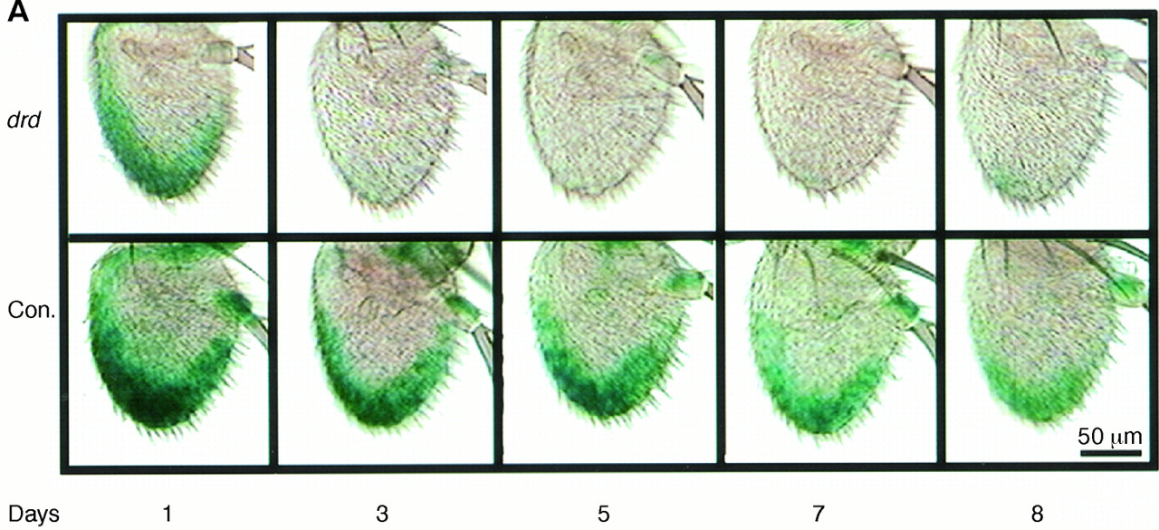A. The green color* shows the reporter signal from an enhancer-trap line in control flies (lifespan, 40 days) and in the short-lived mutant drd (lifespan, 6 days).